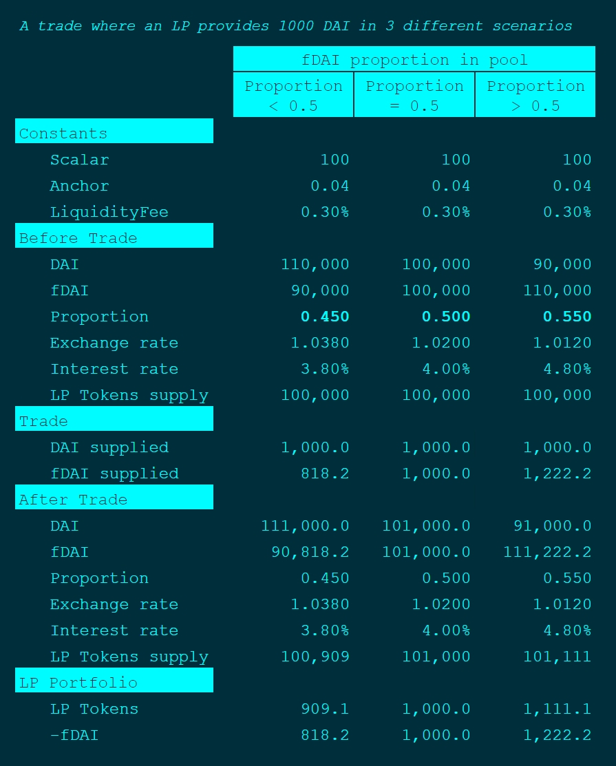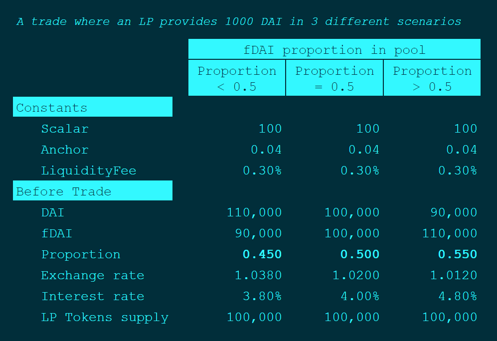 This section will show an example of an LP providing 1000 DAI as liquidity into a single liquidity pool. Since the amount of fDAI the LP needs to mint depends on the liquidity pool's proportion, the example depicts 3 scenarios: