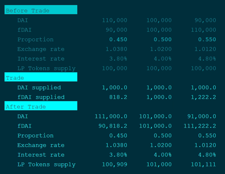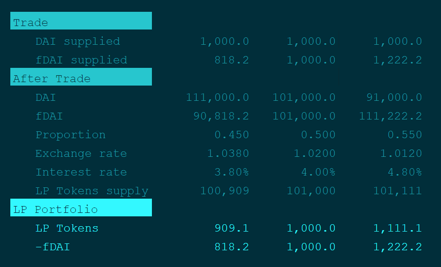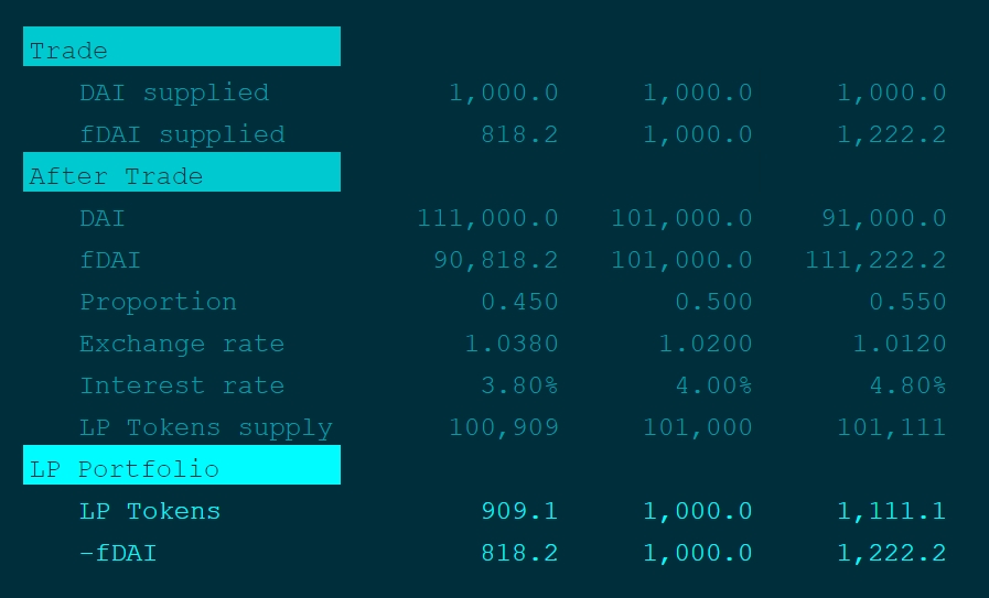 After the execution of the deposit, the LP's portfolio consists of the liquidity tokens and -fDAI. A crucial thing to notice is that the exchange rates and the interest rates never change when LPs provide liquidity.