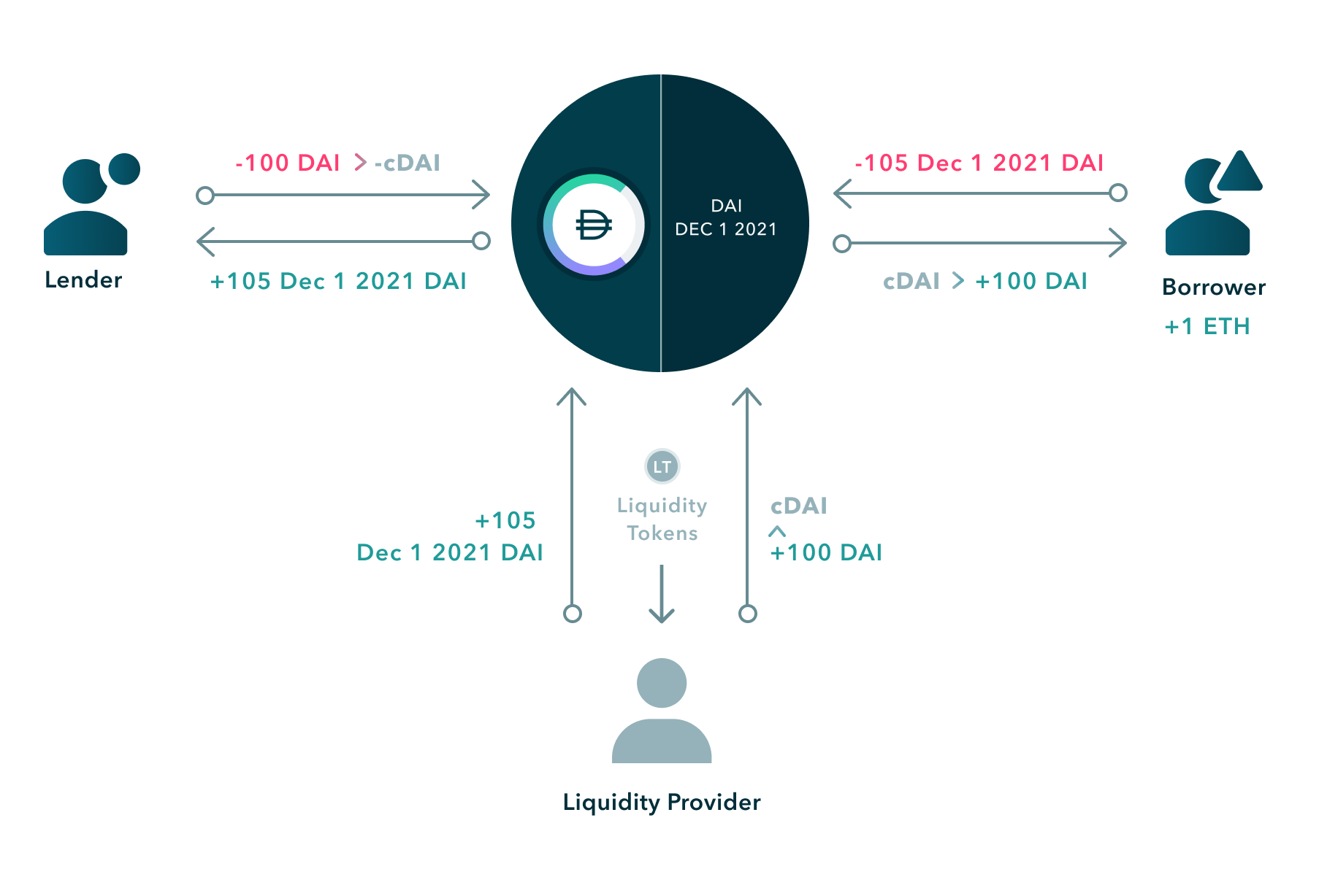 Three user types interact with Notional liquidity pools: lenders, borrowers, and liquidity providers. Lenders deposit cDai into the pool and receive fDai (a promise to receive a fixed amount of Dai at a future date). Borrowers take cDai from the pool and deposit fDai (a promise to pay a fixed amount of Dai at a future date). The liquidity provider adds cDai and Dec 1 2021 fDai into the pool which can be lent or borrowed by either party.