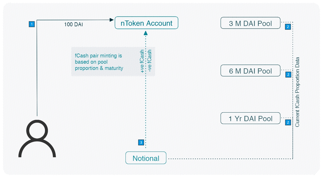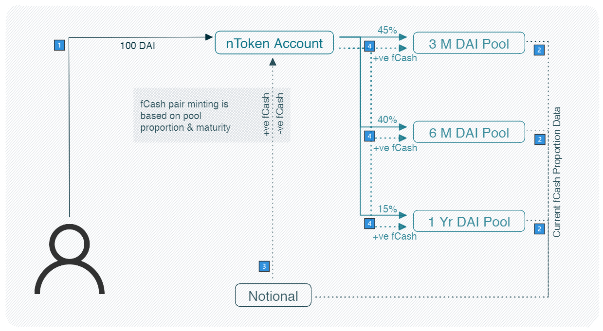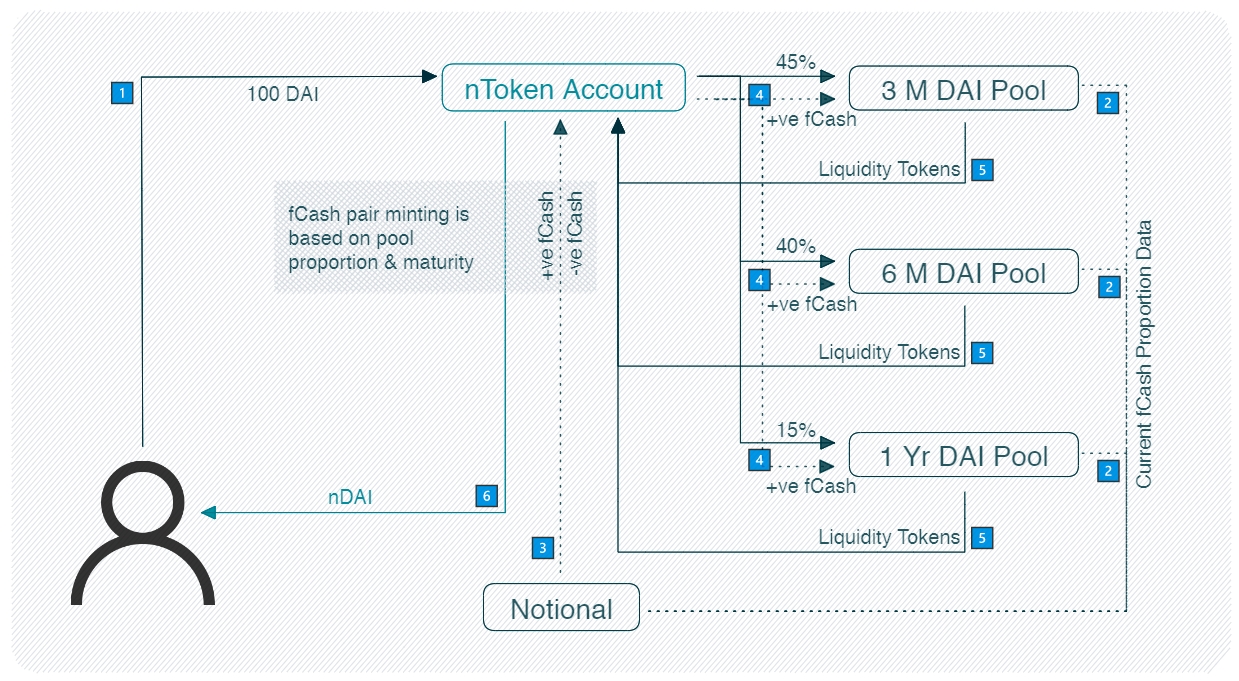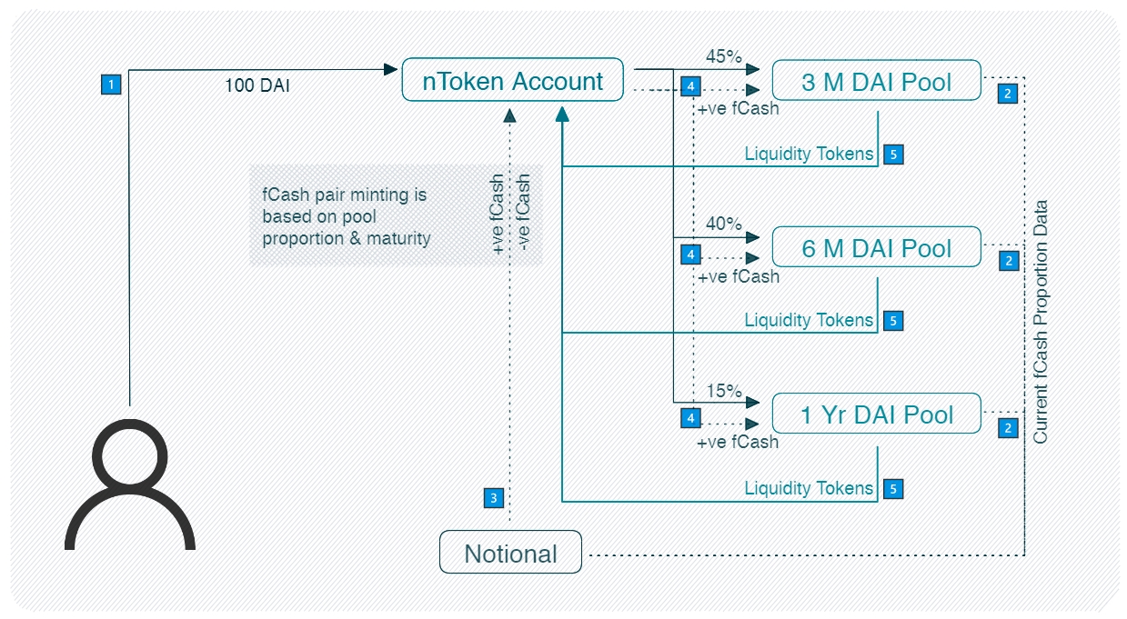 To provide liquidity, the nToken account needs to mint fCash for each liquidity pool and deposit it in the proper proportion. The second step is for the nToken to fetch the proportion data from the liquidity pools