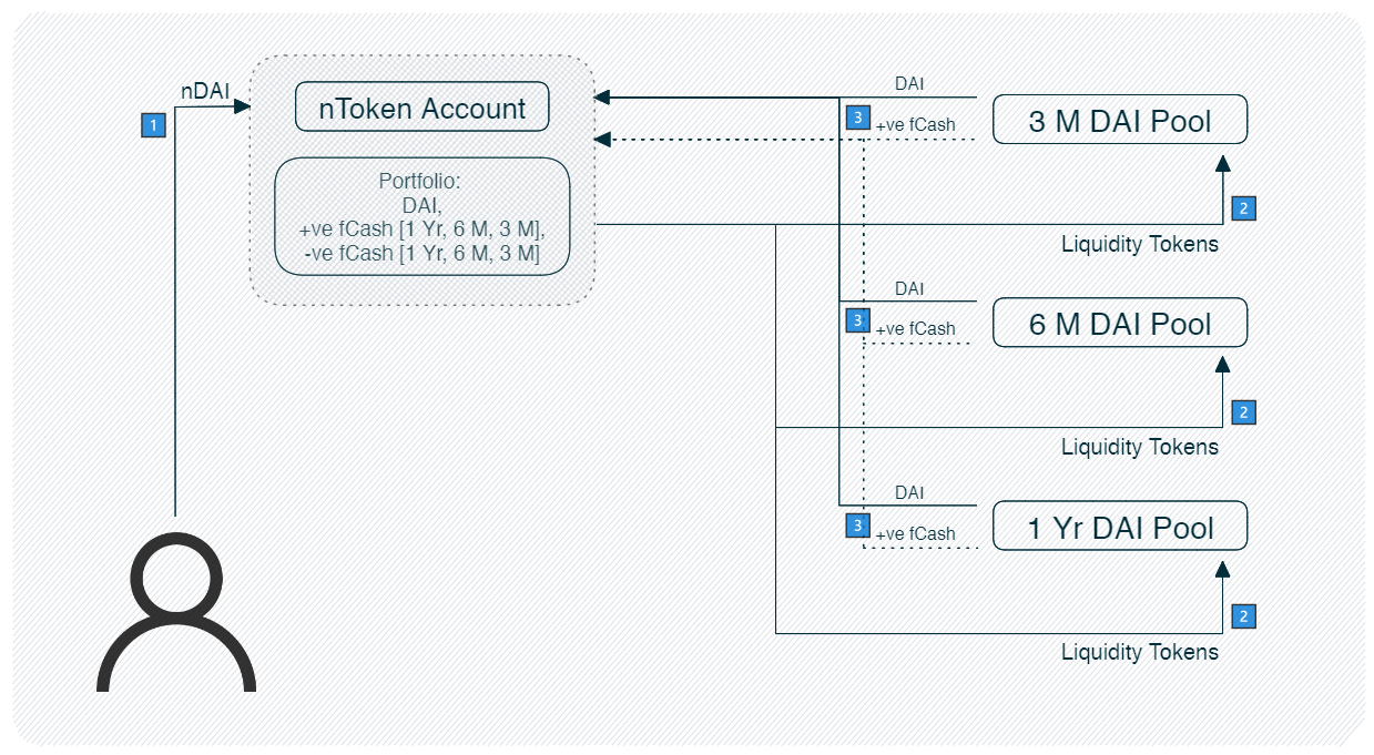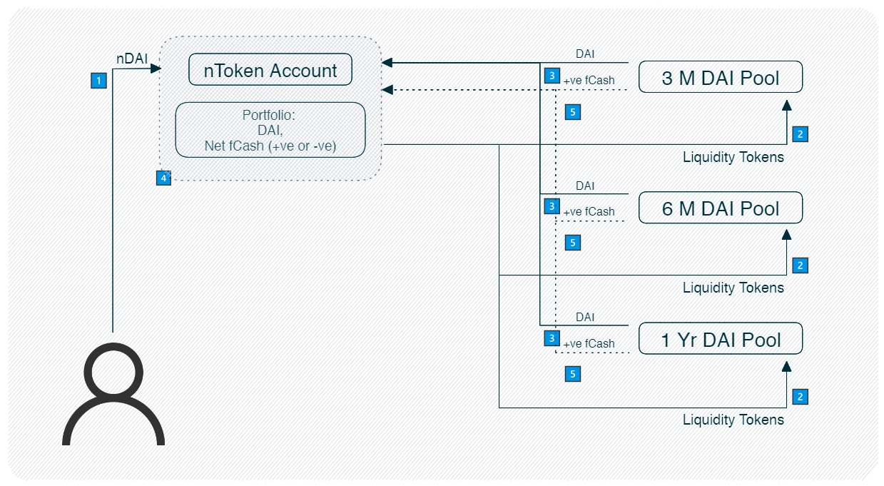 When the nToken account redeems its liquidity tokens, it will receive cash and fCash.