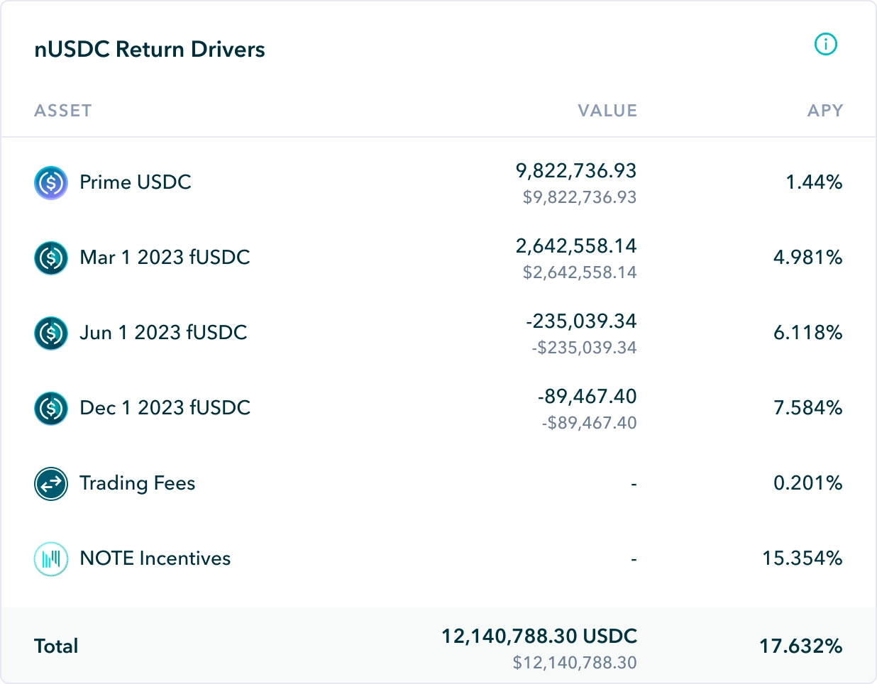 In this example, most of the nUSDC cash is held in prime USDC which is earning 1.44% APY. nUSDC also has net fCash positions in each maturity. It has a net lending position in the March maturity earning 4.981%, and it has small net borrowing positions in June and December.