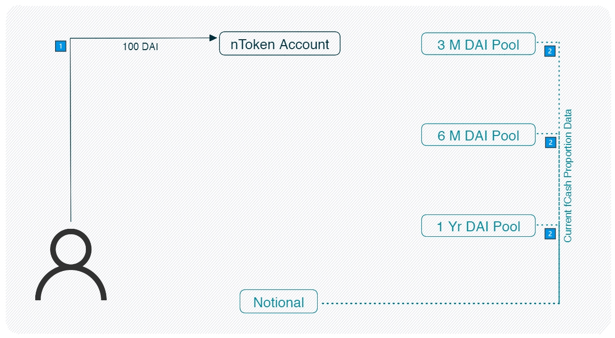 To provide liquidity, the nToken account needs to mint fCash for each liquidity pool and deposit it in the proper proportion. The second step is for the nToken to fetch the proportion data from the liquidity pools