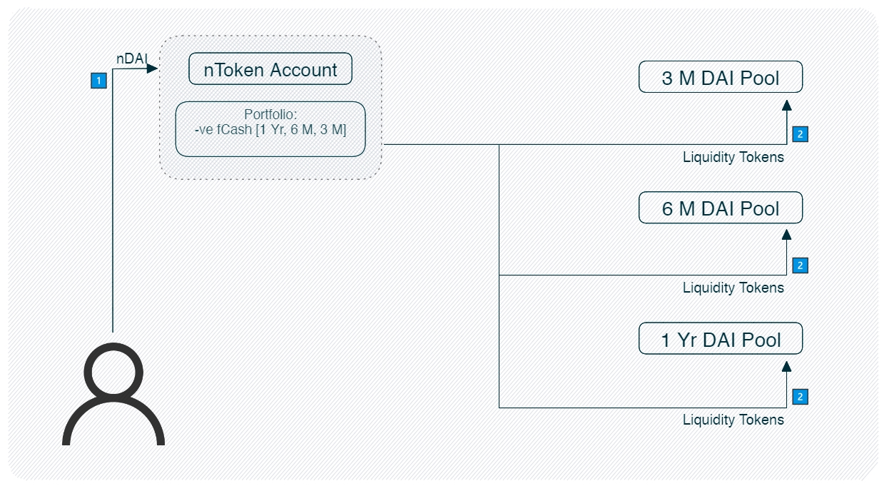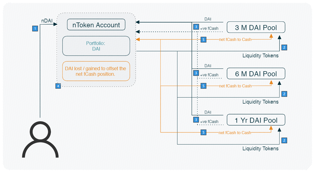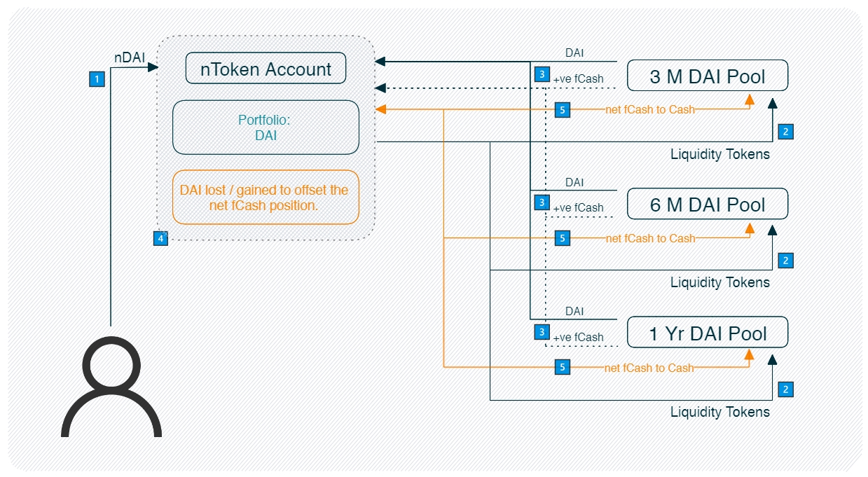 When the nToken account redeems its liquidity tokens, it will receive cash and fCash.