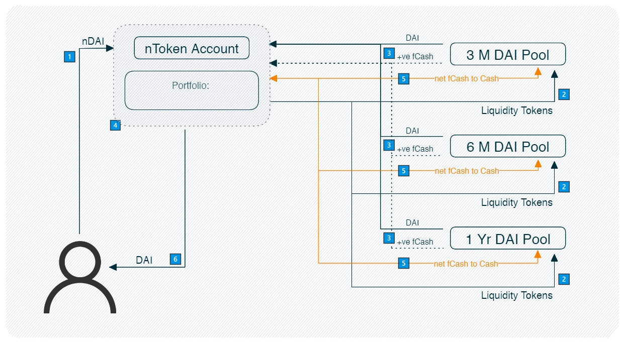 But usually, users don't want the fCash when they redeem. They want to redeem directly to underlying. To do this, users will redeem their nTokens, get their share of the fCash, and then sell that fCash on the liquidity pools to convert fully to cash. The Notional UI does all this for the user in a single transaction.