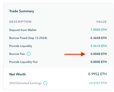 * **Liquidity Provider Fee**: Just like with any other trade in a market, there’s a fee associated with borrowing from a fixed-rate liquidity pool. This fee compensates liquidity providers who enable you to access the fixed rate.