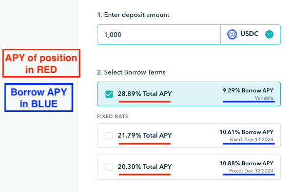4. Input the deposit amount and select your borrow terms. Borrow term options show you the total APY that you will earn and the borrow APY that you will pay on your leverage.
